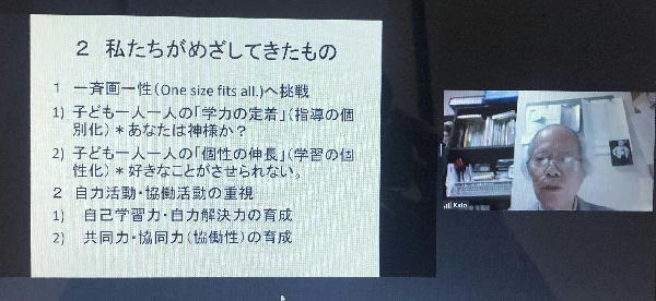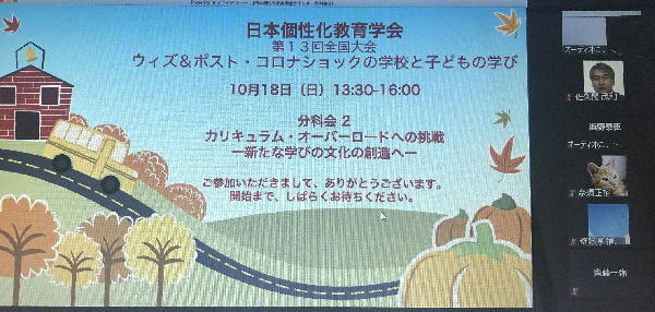 テーマ『ウィズ&ポストコロナ・ショックの学校と子どもの学び』〜個性化教育の新たな可能性〜』 新型コロナウイルスの感染拡大に伴い、今年度の大会はオンラインでの開催となりました。大会では、個性化教育の立場から、ウィズ&ポスト・コロナショックの学校はどうあるべきか、そこにおいてすべての子どもに質の高い学びをどのように保障していくかを考えて参ります。折しも、中央教育審議会において「個別最適な学び」が議題に上がっており、審議状況の報告並びに意義や課題の検討等を行いました。200名を超える参加者を得まして、盛会のうちにおわることができました。